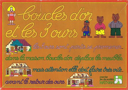 Sur le thème du conte de Robert Southey Le rôle joué par la petite fille lui laisse un peu de décision : si la flèche impose la couleur de la case où elle doit aller, elle peut cependant choisir à chaque fois dans quel sens elle se déplace. Le rôle des ours est lui totalement soumis au hasard, sans aucune décision à prendre. Ils avancent toujours. On pourrait donc s'amuser seul, en jouant successivement la petite fille puis les trois ours par ordre de taille.