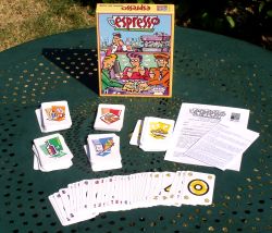 Cette grave omission est maintenant réparée. Espresso est un jeu basé sur la crapette, mais où au lieu de jouer tour à tour, les concurrents se ruent férocement sur toutes les cartes en même temps, dans le but de se débarrasser le premier de son paquet de cartes. Les cartes sont empilées au centre de la table, en paquets allant de 0 à 8. Il suffit, par exemple, de poser un 5 bleu sur un 4 bleu. Le problème, c'est que tout le monde a un 5 bleu et que tout le monde joue en même temps… Chaque partie est une belle pagaille, et il est prudent de ne pas jouer avec des gens qui ont les ongles trop pointus. |
