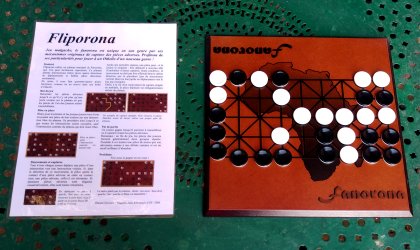 Vincent Everaert nous propose, avec Fliporona, de faire se rencontrer deux classiques des jeux combinatoires, à savoir Fanorona et Othello. De l'un il reprend le tablier original et le mécanisme de prise, de l'autre, il reprend les jetons réversibles et le mécanisme de retournement des pièces conquises. Puisque les pièces conquises ne sont pas retirées mais retournées, il faut quand même faire un peu de place sur la tablier. L'auteur a donc décidé que la pièce venant d'effectuer un ou plusieurs retournements ferait valoir ses droits à la retraite et serait retirée du jeu. Le résultat final est intéressant. |