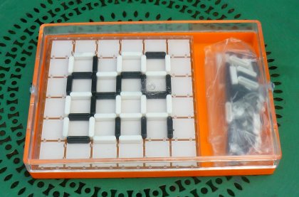 La boîte originale (qu'on peut m'offrir, merci d'avance) comporte un tablier de vingt-cinq cases, de sorte qu'il ne peut y avoir de partie nulle à deux joueurs. 1976 : Les Petits Carrés chez Milton BradleyLa version développée par MB en 1976 comporte soixante-douze cases, mais le nombre de joueurs est limité à deux. Ceci dit, rien ne vous empêche d'adjoindre des jetons d'autres couleurs ou des lentilles ou des rubis (du plus bel effet sur ce fond orangé).