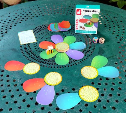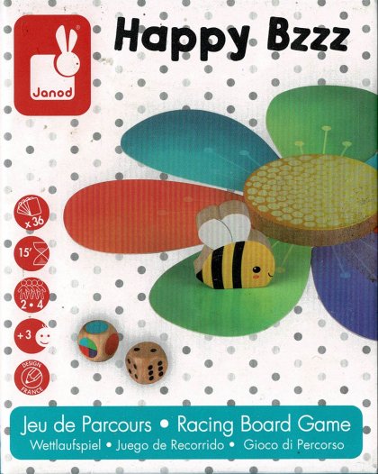 happy Bzzz est un jeu très simple à destination des jeunes joueurs. Le but du jeu est de récupérer le plus de pétales possible. À son tour, le joueur lance deux dés. Le premier dé lui indique sur quelle couleur il doit arriver s'il veut récolter un pétale. Le deuxième dé lui dit de combien de pétales il doit déplacer la petite abeille, dans un sens ou dans l'autre. Vous l'avez compris : tout se joue dans la décision de tourner en sens horaire ou anti-horaire ! Il faut décider avant de bouger l'abeille et pour un tout petit, ce n'est pas si simple, surtout quand il s'agit d'un nombre monstrueusement grand comme 5 ou 6 !