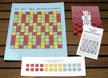 12 Jeux et leur support - Le Jeu des permutations est une création moderne de Charles Truex. Un tablier de 12 × 12 cases est constitué de quarante-huit cases rouges, quarante-huit vertes et quarante-huit jaunes. Chaque joueur possède douze pions disposés au fond de son camp de départ, sur les cases de leur couleur. Le but est de parvenir à amener ses pions sur la rangée opposée, un peu comme aux Dames chinoises. La difficulté est qu'à l'issue de son déplacement, un pion doit atterrir sur une case de sa couleur. La version présentée ici est celle proposée par Michel Boutin dans son recueil 12 Jeux et leur support. |