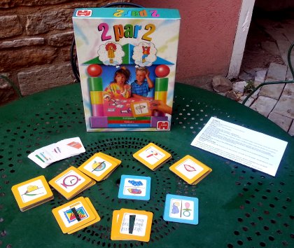 Toutes les cartes de 2 par 2 s'assemblent deux à deux. On joue avec la face bleue visible et il faut chercher les images associées comme par exemple un maillot de bains et une serviette de plage ou un peigne et une brosse à cheveux. Il ne faut pas réunir n'importe quelles cartes mais uniquement celles qui correspondent à la mission. Dans les exemples précédents, les missions sont des cartes représentant respectivement une piscine et une chevelure. Lorsqu'un joueur pense avoir trouvé les cartes répondant à la mission, il les retourne. S'il a vu juste, on retrouve au dos la même image que sur la carte de mission. Un intéressant jeu d'association d'idées pour les jeunes joueurs.