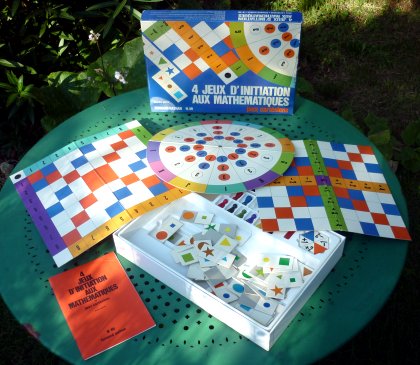 4 Jeux d’initiation aux mathématiques est typique d'une époque, au début des années 1970, où les maths modernes bouleversaient l'enseignement et la tête de nombreux élèves et parents. La boîte propose des jeux basés sur les ensembles et les coordonnées du plan. Pas sûr qu'on s'y amusait beaucoup.