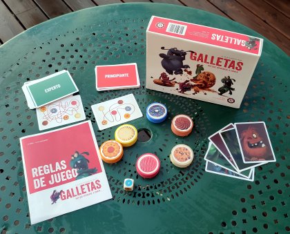 Le monde est une grande ludothèque ! C'est au Cameroun, à l'occasion du Festival Pousse-Pions de Yaoundé, que Roberto Fraga a offert cet exemplaire argentin de Galletas à l'Escale à jeux. Le principe reste le même que dans les éditions occidentales : on continue à courir après des gâteaux et des pâtisseries. Mais le format est bien plus économique pour rester à la portée des portefeuilles sud-américains. Les pièces en bois laissent place à des pièces en mousse dense avec des autocollants.