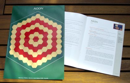« L'Agon est probablement le premier jeu de pions que l'on a pratiqué sur un tablier formé d'un pavage d'hexagones. Apparu dans les recueils de jeux à la fin des années 1800, la plupart des auteurs du xxe siècle en ont déduit qu'il fallait rechercher l'origine de l'Agon vers le milieu du xixe siècle, probablement en Angleterre ou en France. Cette hypothèse est contredite par Jean-Marie Lhôte, qui situe la naissance de l'Agon un siècle plus tôt. Il se réfère à un ouvrage de 1987 sur le mobilier domestique, qui présente une table des Gardes de la Reine (autre nom de l'Agon) datant du xviiie siècle. Actuellement, l'Agon n'est plus présent dans les boîtes de jeux usuelles, mais au début des années 1900, il était encore distribué par les éditeurs. Ainsi, dans son catalogue de 1903, Watiliaux proposait celui qui est reproduit ici. À cette époque, les tabliers d'Agon étaient très colorés, bien que les couleurs n'interviennent pas dans le mécanisme du jeu. Le catalogue d'une exposition de 1984, au Museum of American Folk Art de New York, présente un tablier d'Agon du xixe siècle composé de cinq couleurs. L'Agon est un des rares jeux de pions, en vogue à la Belle Époque, qui est toujours décrit dans les recueils de jeux actuels, bien qu'il ne soit pratiquement plus joué en famille ».