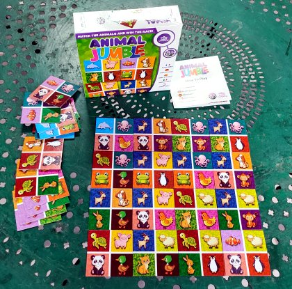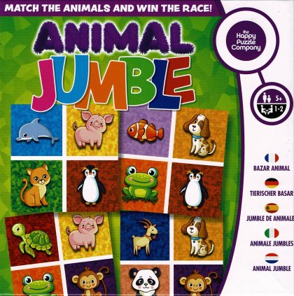 Animal Jumble est composé de 32 dominos carrés comportant chacun 4 animaux. Les deux joueurs se partagent au hasard les dominos pour en recevoir chacun 16. Il s'agit ensuite de créer un carré de 4×4 dominos de sorte que chaque domino possède un animal en commun avec les dominos voisins. Il y a toujours au moins une solution, mais il faut être le premier à reconstituer son zoo ! On peut aussi jouer seul, contre la montre. Il existe, chez le même éditeur, une version un peu plus difficile avec des nombres : Number Jumble.