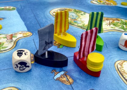 On retrouve un peu le principe déjà développé dans Akaba, à savoir le déplacement des pions par une soufflette. Ici, ce ne sont pas des tapis qui volent, mais des bateaux de corsaires et de pirates, qui voguent dans un univers paradisiaque. Le principe du jeu est simple : déplacer son bateau pour aller chercher des trésors disséminés dans des îles, en se méfiant particulièrement du pirate qui ne cherche qu'à piller nos découvertes chèrement acquises. Un peu d'adresse, donc, mais aussi une part importante de tactique et un petit soupçon de bluff, lors de la phase de pillage par le pirate, qui ne déplaira pas aux amateurs du genre.