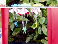 Allez saute ! est un jeu totalement atypique de ma collection. Les joueurs disposent de parachutistes dont la toile est aimantée à un avion, à travers une plaque transparente.