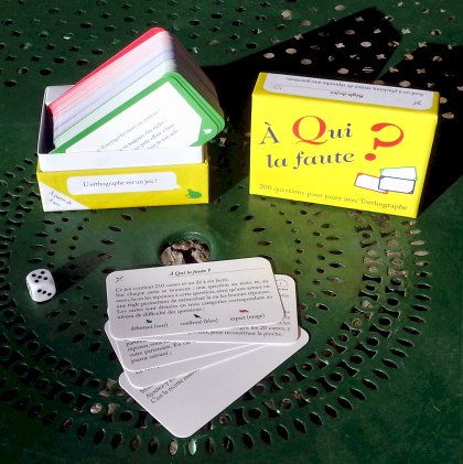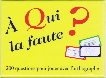 J'essaye, sur ce site, de respecter le lecteur, en évitant autant que faire se peut de lui écorcher les yeux avec une orthographe approximative. Nul n'étant infaillible, je me suis entouré d'aide. D'abord un logiciel qui détecte les plus grosses erreurs. Ensuite des correcteurs bienveillants : pendant plusieurs années, Ivy a corrigé mes fautes en m'expliquant les règles. Lorsqu'elle a décidé de passer la main, d'autres lui ont succédé, Paul faisant l'essentiel des corrections. Écrire correctement n'est pas chose aisée. Rien que le titre du jeu de Marie-France Claerebout, À qui la faute ?, comporte plusieurs pièges. La préposition « À » est accentuée, conformément à la règle. Cet accent avait disparu avec l'invention des machines à écrire, mais, sauf si vous continuez à utiliser une machine à écrire, vous devez laisser l'accent. Le « ? » est évidemment précédé d'une espace (espace est féminin en typographie), sauf si vous écrivez en allemand ou en anglais. La petite boîte contient 210 cartes qui sont autant de questions classées en trois difficultés. Le principal intérêt du jeu réside dans la formulation des réponses. Chacune d'elle est suivie d'une explication simple et facilement mémorisable ou d'une astuce qui permet de mémoriser cette règle. Les orthographes d'usage et grammaticale sont abordées. L'auteur, correctrice professionnelle, a rédigé des questions réellement intéressantes. Pas facile !