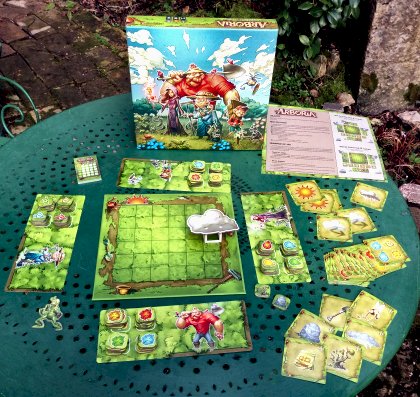 Contrairement à ce qu'évoque son titre, Arboria n'a pas pour thème les arbres mais les fleurs de nos jardins. Quatre jardiniers sèment et font pousser leurs parterres de fleurs dans un même jardin. Chacun bénéficie des fleurs plantées par les adversaires qui l'aideront à marquer des points mais, évidemment, s'efforce d'être meilleur que ses concurrents. À la fin de la partie, on comptera le meilleur score de chacun pour chacune des quatre couleurs. Ce score sera d'autant plus important que la fleur sera haute et le massif de même couleur important. Chaque joueur peut jouer jusqu'à trois cartes parmi celles qu'il a reçues au début de la manche mais il peut aussi utiliser des cartes délaissées par les joueurs précédents. Le dernier joueur du tour a donc plus de choix, ce qui compense un peu le fait que les meilleurs emplacement ont souvent déjà été plantés. L'auteur propose des mécanismes intéressants basés sur le soleil et les nuages. Ceux-ci sont à la fois gênants en ce sens que leur ombre empêche les fleurs de pousser, et en même temps bienvenus quand ils laissent échapper la pluie ! Quelques variantes permettent de pimenter le jeu, qui convient aussi bien aux familles qu'aux joueurs aguerris.