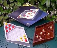 Il est certain que les premiers exemplaires en bois avaient une autre allure que l'espèce de porte-savon gris qu'ils ont ensuite sorti (et qui n'est même pas troué pour laisser l'eau s'écouler). Heureusement que cette aventure ne les a pas découragés, car La Mèche rebelle est aujourd'hui une maison d'édition qui compte, avec ses jeux africains et dernièrement l'extraordinaire Shendao de Valéry Fourcade. Le principe d'Arène, c'est que les pions ne peuvent quitter leur base de départ que vers l'avant, sans jamais reculer, ce qui fait qu'ils finissent bien par arriver en bas, dans l'arène… Et c'est là qu'il faut être vigilant. L'espace est restreint, et le premier qui se fera capturer deux pions perdra la partie. Pour capturer un pion, il suffit qu'il soit entouré par trois autres pions, amis ou ennemis. Il ne faut donc pas avancer en rangs trop serrés. Les pièces se déplacent simplement d'une case à une case adjacente. À chaque tour, le joueur doit déplacer deux pièces d'une case, et ne peut pas déplacer deux fois la même. La règle livre plusieurs positions de départ possibles qui modifient légèrement le jeu. Arène est donc avant tout un objet de collection, mais surtout un agréable jeu tactique et rapide pour les amateurs d'abstraction. On préfèrera bien sûr la version en bois, mais le kitsch, parfois, ça a du bon… |