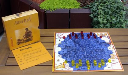 Certains jeux se pratiquent sur des cases, d'autres sur des intersections. Armada se pratique sur les deux : deux types de pièces se déplacent sur les intersections et un type de pièce se déplace de case en case. À part ça, bon ben… c'est un jeu de pions et d'affrontement, quoi. |