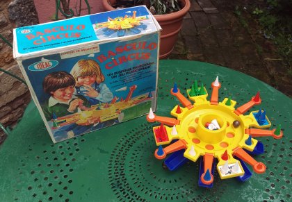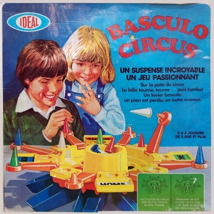 Basculo Circus est un jeu de poursuite dont le but est classique : amener le premier un de ses cinq pions sur sa case de départ après lui avoir fait faire un tour complet. Pas de dé mais une bille en acier qui tourne et termine sa course sur l'une des cases à bascule orange. La case bascule alors, éliminant le pion qui s'y trouve éventuellement et faisant apparaître un nombre. Vous pouvez alors avancer un de vos pions de ce nombre. Chacun possède cinq pions. En ramener un seul suffit et pourtant la tâche n'est pas si facile. Vos pions risquent en effet de subir deux types d'agression. D'une part, si un autre pion les atteint, ils sont renvoyés à leur case de départ. D'autre part, s'ils terminent leur parcours sur une case bascule orange, ils risquent d'être éjectés quand la bille termine sa course sur cette case.