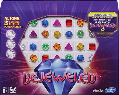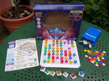Bejeweled reprend le principe du jeu vidéo homonyme : en alignant trois gemmes ou plus de même couleur, vous gagnez un ou plusieurs jetons de victoire de la couleur des gemmes alignées. Lorsque vous êtes en possession de trois triplés - par exemple trois jetons jaunes, trois rouges et trois violets - vous avez gagné la partie. La règle est limpide mais une seule chose reste à mes yeux incompréhensible : pourquoi présenter ce jeu comme réservé aux filles ? C'est ce que semble indiquer le dos de boîte : « Sois la première à remporter un maximum de jetons pour gagner », ou la promo de l'éditeur : « Enfin une gamme de jeux pour filles ».