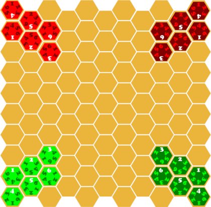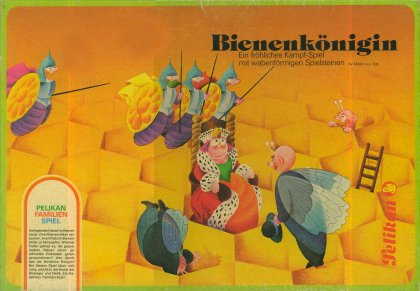 Bienenkönigin contient en fait deux règles distinctes, qui se pratiquent sur le même tablier, avec les mêmes mouvements de pièces. Chaque camp possède six pièces numérotées de 1 à 6 sur ses six côtés. Chacune des pièces est orientée au départ selon l'un des six chiffres. Les pièces se déplacent dans chacune des six directions, d'un nombre de cases égal au chiffre se trouvant sur le côté concerné. Bienenkönig - Course d'abeillesDeux ou quatre camps s'affrontent. Les pièces ne peuvent pas prendre de pièces adverses.