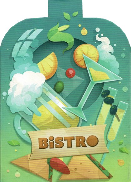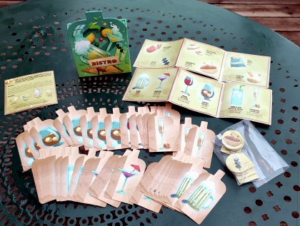 Une jolie présentation pour Bistro, un jeu de bluff pas vraiment original mais amusant. À noter que les auteurs ont l'élégance de remercier les « Grands anciens du bluff » dans la règle, à savoir Le Menteur, Skull & Roses et Kakerlakenpoker. Le principe du jeu est d'ailleurs très proche de celui de Kakerlakenpoker : on propose une carte (un p'tit verre) à un joueur que celui-ci peut accepter ou refiler à un autre. Celui qui se trompe gagne la carte et ce n'est pas vraiment une bonne chose : un verre ça va mais six verres différents ou trois verres identiques, bonjour les dégâts ! Note : on n'en voudra pas aux auteurs, qui habitent en Charente-Maritime, d'ignorer qu'un vrai apéritif ne se conçoit pas sans un verre de mâcon blanc.