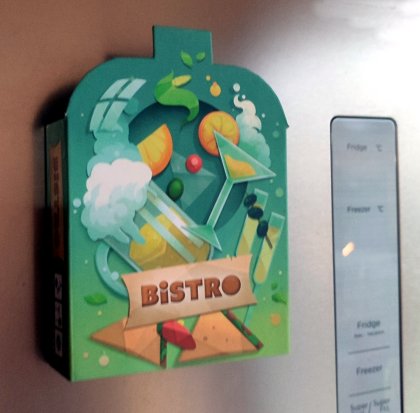 La boîte de Bistro pose un problème à l'Escale à jeux. Tous les jeux sont en effet rangés, soit en étagères, soit en tiroirs, soit en réserve, soit en archives. Celui-ci est censé se placer sur le frigo, grâce à son dos de boîte aimanté. Encore un problème à résoudre !
