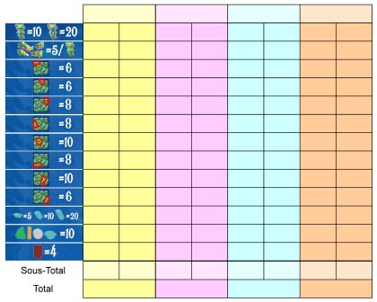 De nombreux jeux se gagnent en additionnant en fin de partie des points gagnés de diverses manières. Les plus intéressants — Blue Lagoon en fait partie — sont ceux où les conditions de marque sont antagonistes. Dans Blue Lagoon, on marque des points essentiellement de deux façons : d'une part en explorant un maximum d'îles, d'autre part en prenant des majorités sur des îles. Et il est difficile, mais pas impossible, de courir après les deux lièvres. L'autre intérêt du jeu réside dans le fait qu'on joue en deux manches à l'issue desquelles les décomptes seront similaires, mais qui sont différentes dans leur point de départ. Lors de la première manche, on arrive dans les îles par la mer. On les explore et on place quelques villages. La deuxième manche se déroule comme la première mais on ne part plus de la mer mais des villages construits en première manche. Il ne faudra donc pas négliger cette urbanisation. Le jeu est passionnant à deux joueurs. À plus, des alliances se créent inévitablement. Je conseillerais, à quatre, de jouer en équipe en additionnant en fin de partie les scores des partenaires. Le bonus de l'Escale à jeuxVous trouverez, à la suite des règles, une feuille de marque légèrement modifiée pour faciliter le décompte des majorités et l'addition des points des deux manches.