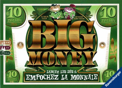 L'idée de Big Money est de combiner un mécanisme de lancer de dés de type Yam’s avec un thème boursier. Cinq dés permettent, en les combinant après un maximum de trois lancers, de former des figures classiques : full, carré, brelan, etc. pour gagner des billets que l'on réinvestit dans des actions. Le sixième dé indique l'une des cinq industries (sport, alimentation, tourisme, loisirs, technologie) et permet aux propriétaires d'actions de ce type d'encaisser leurs gains. La sixième face du dé impose de tirer une carte “Breaking News” qui est toujours une mauvaise nouvelle pour un ou plusieurs joueurs : bulle financière, récession, loi anti-trust, etc. La règle s'apprend et se maîtrise très facilement, d'autant plus que tout est rappelé sur le petit plateau de jeu. On peut être surpris par le peu de matériel que l'on trouve dans la bien grande boîte, mais on est maintenant habitués à ce genre de déconvenue. La nouveauté, c'est que le titre du couvercle est presque plus grand que tout le matériel de jeu.