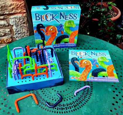 Le monstre du Loch Ness existe : on en a même observé quatre ! Dans Block Ness, chaque joueur fait évoluer son propre serpent de lac en le faisant plonger et réapparaître un peu plus loin. Les joueurs rivalisent pour trouver un coin de lac où nager mais la place est de plus en plus réduite. Celui qui parviendra à nager le plus longtemps (qui posera le plus de morceaux) gagnera. En cas d'égalité, c'est celui qui aura la tête la plus haute qui l'emportera. À deux joueurs, ou à quatre en équipes de deux, il n'y a aucun hasard. À trois ou quatre, jouant individuellement, vous pourrez évoquer une alliance de vos adversaires pour justifier votre défaite !