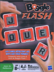 Quand on fait des anagrammes avec des lettres, on tripote ses jetons ou on mélange les cartes qu'on a en main. Cette méthode est naturelle, au contraire de celle qui consiste à cliquer avec une souris ou à tapoter sur un clavier. Boggle Flash s'est donc adapté à nos habitudes ludiques en mettant l'électronique au service du jeu de société. Cinq « pico-ordinateurs » affichent des lettres avec lesquelles nous devons composer des mots de trois à cinq lettres. Lorsqu'on en trouve un, il suffit de bouger les cubes pour les aligner convenablement. C'est alors que la fée électricité agite sa baguette magique : si le mot est accepté, nous sommes récompensés par un « bip » et un clignotement des cubes. Bien sûr, il est préférable d'être amateur de jeux de lettres. Si c'est le cas, l'objet va rapidement devenir indispensable, d'autant plus que l'éditeur a eu l'excellente idée de fournir une petite boîte qui contient tous les éléments pour jouer, et qui peut se transporter dans la poche. Réellement génial !
