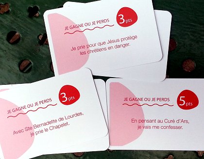 Quelques cartes permettent de personnaliser les bonnes actions. Je vous propose de créer « J'invite à goûter mon jeune voisin réfugié chrétien d'Orient, sans-abri et handicapé, je lui parle du sacré cœur de Jésus, lui fais l'aumône et lui donne mon jouet préféré. Je gagne dix points et je reçois les stigmates. »