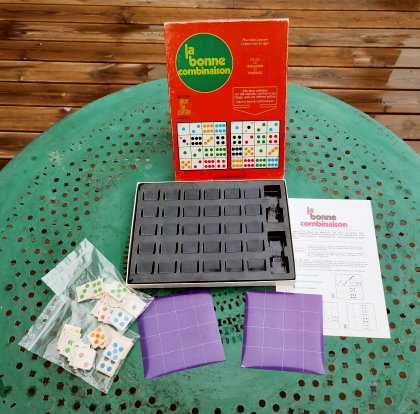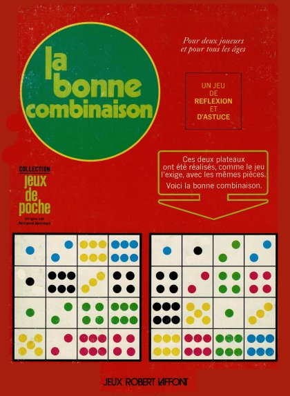 Publié en 1974, La Bonne Combinaison supporte bien la comparaison avec d'autres jeux mettant en œuvre le mécanisme du « 0 ». Le jeu appartient à la collection « Jeux de poche ». Je suppose qu'il s'agit des poches d'un pantalon de treillis XXXL car le jeu est au format A4 ! Deux joueurs s'affrontent et bénéficient du même tirage. Seize tuiles seront tirées aléatoirement les unes après les autres depuis un ensemble de trente tuiles numérotées de 1 à 6 dans cinq couleurs. Après le seizième tirage, chacun va compter ses points en marquant des points pour chaque combinaison qu'il a créée dans les quatre lignes et les quatre colonnes. Les combinaisons rappellent celles du poker, la plus rémunératrice étant la suite à la couleur qui rapporte 10 points quel que soit l'ordre des tuiles dans l'alignement. On peut tout à fait jouer à La Bonne Combinaison avec un simple jeu de tarot (on prendra les cartes 1 à 6 des quatre couleurs et de l'atout), du papier et des crayons. On pourra alors jouer avec un nombre quelconque de joueurs.