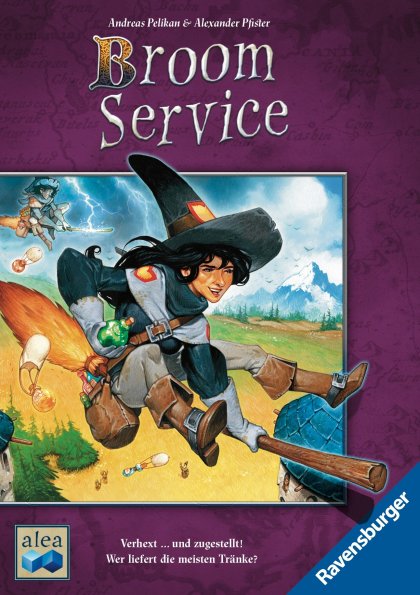 Broom Service reprend le thème et le mécanisme principal de Malédiction en y ajoutant un plan sur lequel nos sorcières vont se promener pour récolter des récompenses et donc des points de victoire. Les deux pions des joueurs sont tantôt des cueilleurs qui récoltent des ingrédients pour les potions, tantôt des sorcières qui volent vers une région voisine pour y livrer leur production, tantôt des druides qui livrent sans se déplacer, tantôt des fées qui chassent les mauvais nuages. Chacun programme secrètement les rôles qu'il aimerait jouer à ce tour, en espérant un ordre idéal, mais ça ne se passe jamais comme on l'entendait. Pour mettre le plus de chances de son côté, il faut donc prévoir diverses chronologies, ce qui n'est pas du tout aisé. Le jeu est proposé avec de multiples variantes qui peuvent se composer les unes avec les autres, ce qui permet des parties très variées. La règle de base s'explique assez vite ce qui rend le jeu abordable par des joueurs peu chevronnés.