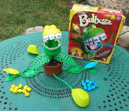 Jeu de catapultage, Bulboza n'est pas pour autant un jeu frénétique. Deux joueurs s'opposent en essayant de faire avaler le premier dix mouches à la plante carnivore. Celle-ci tourne et, de temps en temps, s'arrête en face de la catapulte d'un joueur qui doit alors tenter d'envoyer une mouche. Mais son adversaire va essayer de l'en empêcher en pressant la poire qui ferme la gueule de la plante. Renouvelle agréablement le genre.