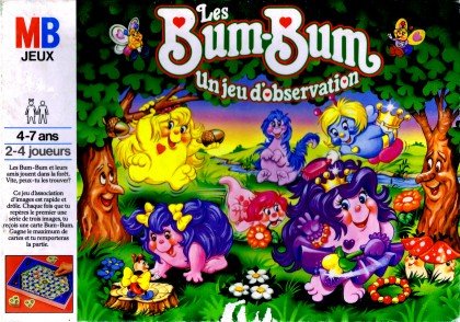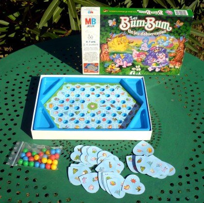 Les Bum-Bum est, comme indiqué sur la boîte, un jeu d'observation rapide. Le matériel se compose d'un tablier réversible et de cartes également imprimées des deux côtés. On peut ainsi jouer avec la face verte ou la face bleue. Le but du jeu est de trouver le seul emplacement entouré des trois symboles visibles sur la carte retournée. Chaque symbole est présent deux fois sur le tablier. Il s'agit donc de rapidement situer un des éléments, mais ce n'est pas encore gagné. Si aucun des trois trous autour de cet élément ne convient, il faut vite trouver l'autre emplacement, puis le bon trou. À moins qu'on ne se soit fait griller la politesse.
