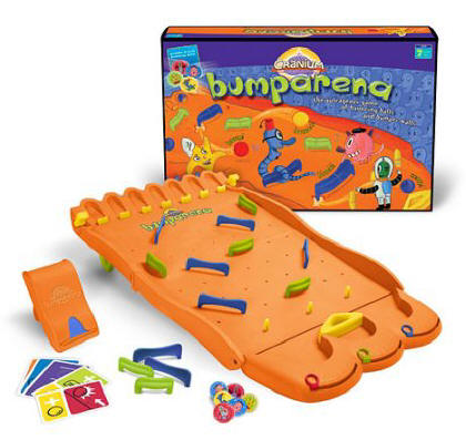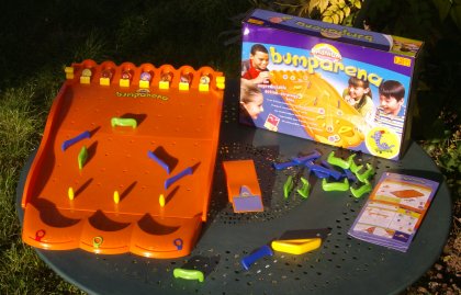 Le but est de marquer six points et, pour cela, de récupérer six billes dans la poche qui nous est attribuée en bas de la piste. Chaque carte tirée permet de placer des obstacles pour dévier les billes, de les déplacer sur la ligne de départ, etc. Lorsque les billes sont lâchées, seule la loi de la gravité commande le gain de la partie. Mais il n'est pas toujours facile de maîtriser la gravitation, surtout quand les billes rebondissent énormément. Le matériel est de très belle qualité, et en quantité plus que suffisante. Bumparena est prévu pour les enfants, mais il ravira aussi les parents. Un jeu réellement riche en rebondissements !