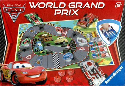 Cars 2 World Grand Prix est une classique course de voitures régie par des dés. Chacun possède deux éléments de jeu : une voiture montées sur un socle qui est son pion et une grande boîte de vitesse en forme de voiture également qui permet de gérer ses rapports et donc d'utiliser plus ou moins de dés. En cas d'incident ou d'accident, on perd une roue. Curieusement, la course continue tant qu'on possède encore au moins une de nos quatre roues ! Quand on perd la dernière roue, on s'arrête au bord de la route et l'atelier, gentiment, nous apporte quatre nouvelles roues. Le matériel est médiocre et la boîte de vitesse s'abîme très rapidement. Un jeu dispensable.