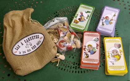 De trois à six joueurs s'affrontent, et se confrontent, autour de cartes organisées en quatre grands corps de métiers : commerce et industrie, arts et sciences, agriculture et artisanat, administration et services. Selon la case où votre pion atterrit, vous devez vous prêter à diverses épreuves : quiz, mime ou saynète, etc. Selon les cas, c'est vous qui devez trouver ou, au contraire, un autre joueur. Le plaisir principal du jeu, mais aussi sa difficulté, ce sont les saynètes, où vous devez interpréter un métier avec un scénario imposé, dans le but d'emporter la conviction pour gagner des cahuètes. Car le jeu des métiers ressemble ici à la réalité : même si vous êtes excellent, vous ne gagnez que des cahuètes. Le matériel de jeu est de toute beauté, et quand on soupèse la boîte, on voit tout de suite qu'on en a pour son argent. Le jeu est entièrement fabriqué en France, sauf le sablier qui a probablement été rempli de sable jaune… 2008 : Sac à Cahuètes