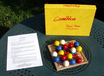 Caméléon se joue sur un tablier de 3 × 3 cases, et utilise le même système de poussée de boules que Abalone, Aboculis ou Akiba. Sauf que Caméléon commence par un C ! Et sauf qu'on pourrait tout aussi bien jouer avec des pions ou des tuiles.
