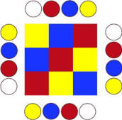 Au départ, le tablier est vide. Chaque joueur, à tour de rôle, introduit une bille sur trouvant sur l'un des quatre côtés vers une case de ce même côté, en poussant éventuellement les billes déjà en place. Si cette poussée fait sortir une bille en face, il est interdit de la réintroduire au même endroit, dans un mouvement inverse au précédent. Il existe deux règles. L'une défensive, l'autre offensive. Règle défensiveLe but du jeu est d'aligner trois billes verticalement ou horizontalement. Il s'agit donc de ne pas offrir de solution gagnante en un coup à l'adversaire. On gagne en principe lorsque l'adversaire ne peut plus éviter de vous donner la victoire. Règle offensiveC'est celle que je préfère. Le but d'un des joueurs est de réaliser un alignement vertical, celui de l'autre joueur de réaliser un alignement horizontal. Croyez-moi, c'est très vicieux. Le jeu se pratique idéalement à deux. On peut le pratiquer trois. À quatre, il faut jouer en équipes. N'hésitez pas vous fabriquer un modèle personnel : Caméléon peut se jouer avec des bouchons de bouteille et un tablier rudimentaire. L'idéal est de remplacer les pions blancs par des pions transparents. Caméléon n'appartient pas au domaine public, mais il est possible de s'en réaliser un exemplaire personnel à usage privé et non commercial. |
