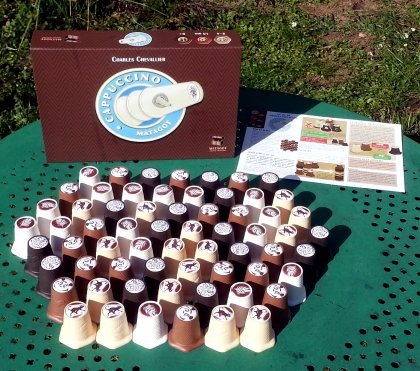 Bien qu'amateur de café, je n'étais pas spécialement attiré par l'aspect sévère de la boîte de Cappuccino. Un rapide aperçu de la règle m'avait laissé penser qu'il s'agissait d'un énième jeu d'empilement, dans la famille de Avalam Bitaka ou Dvonn. Mais dès la première partie, j'ai vu ce que le jeu recelait d'intelligence, impression confirmée par la deuxième partie, la troisième, et toutes les suivantes. Le mécanisme très simple et la variété des parties, due à la mise en place initiale, font de Cappuccino un jeu indispensable dans toute bonne ludothèque de club. La seule difficulté semble être l'attribution des pions panda !