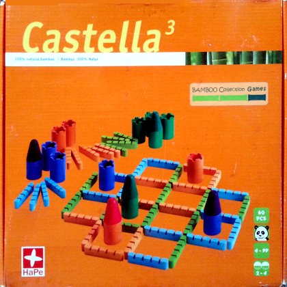 Castella³ est un descendant direct de La Pipopipette. Deux différences : le terrain n'est pas limité ; on peut déplacer les murs une fois que tous ceux ci ont été placés. Castella³ est un développement du jeu Castella, du même auteur et éditeur, mais qui ne se jouait qu'à deux joueurs. De fait, on peut jouer à Castella avec Castella³ en utilisant deux des trois couleurs. Variante des châteaux coiffésChaque joueur dispose de 5 châteaux dont trois nus et deux surmontés d'un toit. La règle ne prévoit pas d'utilisation particulière de cette différence. Mais rien ne vous empêche d'en imaginer :
