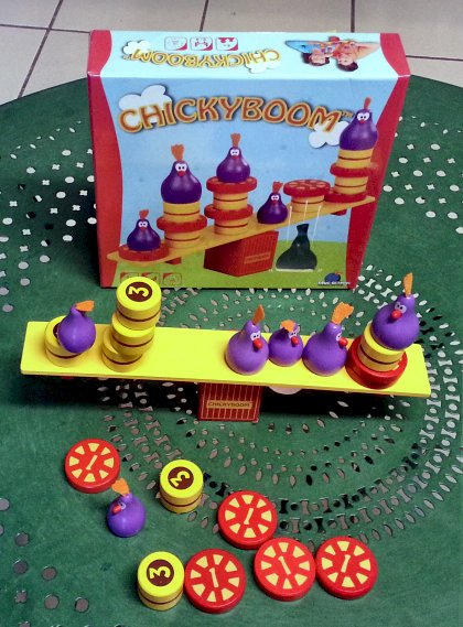 Dans la plupart des jeux d'équilibre, il faut empiler des objets. Dans Chickyboom, c'est l'inverse. Après avoir placé toutes les pièces sur la planchette, vous positionnez celle-ci sur son socle; Il d'agit ensuite de retirer peu à peu les pièces dont la valeur est d'autant plus importante qu'elles sont plus lourdes. On y joue avec plaisir à tout âge. La qualité du matériel et la simplicité de la règle font que Chickyboom prend difficilement la poussière.