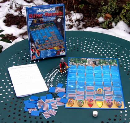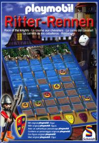 Chacun des jeunes joueurs incarne un chevalier qui construit son pont flottant pour atteindre le château, et vaincre le chevalier Playmobil. Tout cela se passe en jetant le dé ! Si le but avait été d'atteindre le chevalier, le jeu aurait pu se traduire « La Course au chevalier ». Si l'on considère que six chevaliers y font la course, le jeu aurait dû s'appeler : « La Course des chevaliers ». Mais peut-être qu'un traducteur français était trop cher pour Schmidt ? Ceci dit, le jeu est amusant pour de jeunes joueurs espiègles, qui apprécieront de pouvoir se dérober des morceaux de pont flottant. Et c'est bien le but, non ? |