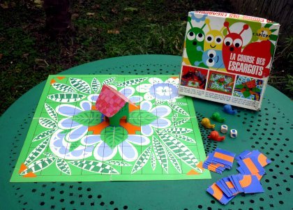 La Course des escargots s'adresse à deux, trois ou quatre jeunes joueurs. Le but est de former un chemin jusqu'à la maison centrale, et d'y amener son escargot. La Course des escargots fait un peu penser au jeu Le Petit Poucet, en beaucoup plus simple. Il n'existe en effet que deux types de tuiles : le chemin droit et le chemin qui tourne. Le joueur qui se présente face à l'une de ces deux arrivées a une chance sur deux d'obtenir au dé la bonne tuile. Si le dé lui indique la mauvaise tuile, il aura encore une seconde chance en avançant vers la seconde entrée de la maison. Mais s'il échoue encore, il doit reprendre toutes ses tuiles et recommencer entièrement son chemin. Autrement dit, il va en baver ! Anecdotique et réservé aux collectionneurs… Et aux nostalgiques qui avaient six ans en 1975.