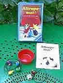 Dans ce jeu de réflexes, le chasseur lance un dé de couleurs qui indique quelle souris il doit attraper. Il tente alors de le faire à l'aide du gobelet rouge. Seul le joueur possédant la souris concernée a le droit de tirer sa souris en arrière. On peut compliquer les règles, mais Attrape-moi ! reste quand même extrêmement simple et plutôt destiné aux très jeunes joueurs. La mention « 5 à 99 ans » est tout à fait abusive. Le Chat et les SourisLe Chat et les Souris est une adaptation de toute beauté d'un grand classique connu sous différents noms. Le plus courant est Gare au loup, même si le thème est généralement plutôt celui d'un chat essayant d'attraper des souris, qu'un loup s'attaquant à de faibles brebis.