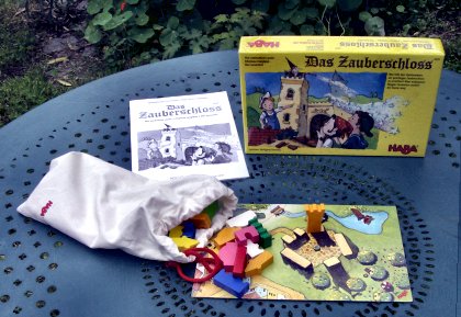 Château magique est un jeu où le hasard a une part importante. Mais une bonne reconnaissance tactile est également nécessaire. Le but du jeu est d'assembler le premier un château de toutes les couleurs. Pour cela, il faut chercher dans le sac une pièce qu'on ne possède pas encore, c'est-à-dire d'une forme et d'une couleur différentes de celles des pièces déjà construites. Parfois, on tire une couleur déjà posée : pas de chance, il faut remettre les deux pièces dans le sac. Parfois, on tire une pièce de même forme qu'une pièce déjà posée : il faut aussi remettre les deux pièces dans le sac mais là, il est difficile d'invoquer la malchance ! Parfois, on tire une pièce blanche d'une forme qu'on n'a pas encore, et là, c'est le bonheur : on peut voler une pièce à un autre joueur si elle est de même forme et d'une couleur qu'on n'a pas encore. Si plusieurs joueurs ont une pièce valable, il faut choisir à qui voler… sauf si l'un d'eux est papa, bien sûr, auquel cas le choix est évident.