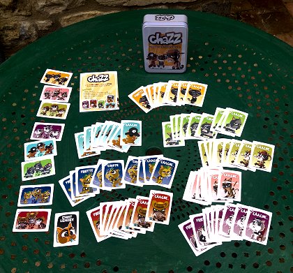 Le but n'est plus seulement de ne pas se retrouver sans chaise mais aussi de s'asseoir sur une chaise qui fait face à une ou deux cartes qui nous intéressent. L'idée est de parvenir à disposer trois cartes différentes devant la même chaise pour la conquérir (on parle de ici de conquérir un territoire). Dès qu'un joueur contrôle deux territoires, il remporte la partie. Même si on ne jouera pas tous les jours à Chazz, le principe de mélanger jeu d'action et jeu tactique est intéressant. |