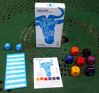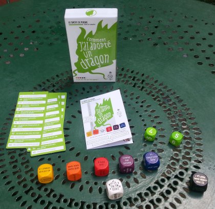 Les jeux d'improvisation mettent facilement de coté certains joueurs qui ont du mal à s'exprimer en public. Pour pallier ce défaut, il faut imaginer un dispositif qui facilite le récit. C'était par exemple l'excellente idée du téléphone factice dans Délirophone. Dans Comment j’ai adopté un gnou, l'objet qui facilite le récit est en même temps le nerf du jeu : une série de dés comportant des éléments de phrase. Le but est de raconter une histoire en intégrant ces morceaux de phrase dans le récit. On part d'un thème tiré au sort (ou choisi) et le récit s'enchaîne comme par miracle. Simple et amusant. 2016 : Comment j’ai adopté un dragon