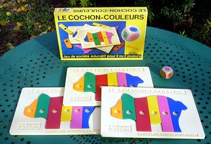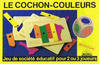 Le Cochon-Couleurs, c'est le grand classique Le Cochon qui rit adapté pour les très jeunes joueurs. Les petites pièces pouvaient facilement être avalées : elles ont été remplacées par des plaquettes en plastique qui constituent peu à peu le cochon. Un gros dé coloré complète le tout. Le Cochon-Couleurs, régi par le seul hasard, met en œuvre la reconnaissance des couleurs et des formes.