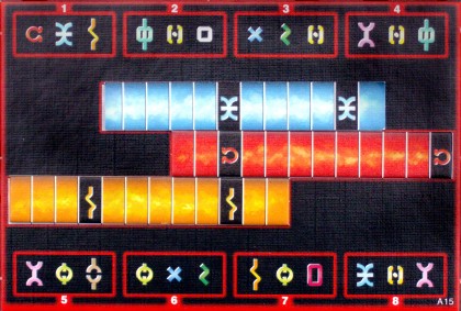 La boîte contient un matériel impressionnant… Ci-dessous, le matériel d'un des joueurs. Sur la plaque, trois barres correctement positionnées pour reconstituer un code.