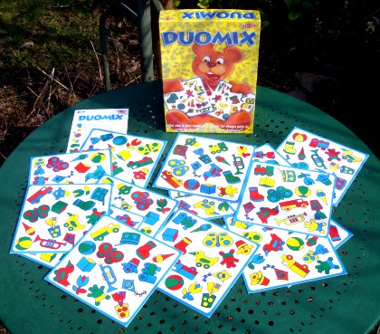 Facile ? Alors, trouvez vite l'objet identique sur la photo ci-dessus ! 1999 : édition cartes géantes chez TacticLa première édition était à compte d'auteur en 1995. En 1999, Tactic sort le jeu sous le nom Duomix, avec d'incroyables cartes géantes de 20 × 20 cm.