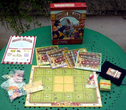 Coney Island… La grande roue du temps s'emballe ! Mais pourquoi donc les jeux tournent et tombent-ils si vite dans l'oubli ? J'avoue avoir acheté Coney Island en solde parce que la boîte était belle et son auteur bien connu. A l'ouverture, forte déconvenue : tuiles mal collées, inutilisables. Je joins le SAV de l'éditeur… Jeu trop ancien, pas de pièces. Eh oui, il faut y penser pour les vieux jeux…