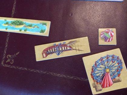 Et là, miracle : mon vendeur (Parkage pour ne pas le nommer) m'assure (et me rassure) que « même en solde, je suis en droit d'attendre un jeu nickel » et me propose de le compléter avec les pièces d'une boîte abimée qu'il a en stock. Alors là, chapeau ! Première impression : la boîte est très évocatrice de la fête foraine, le matériel… Et bien, à part les quelques tuiles attractions (quand même), on ne se sent pas à la fête !